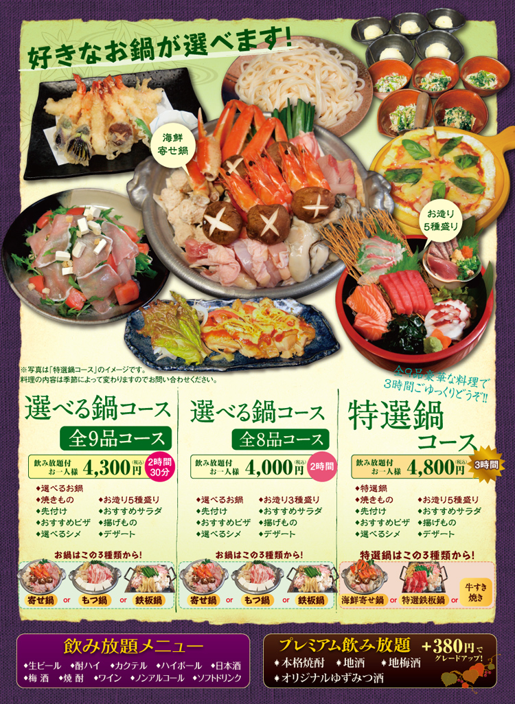 ●予約時間に遅れた場合は、飲み放題時間が短くなる場合がございます。